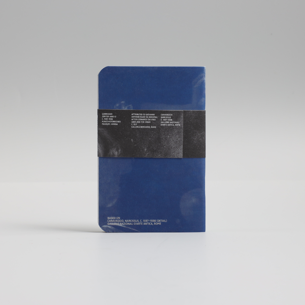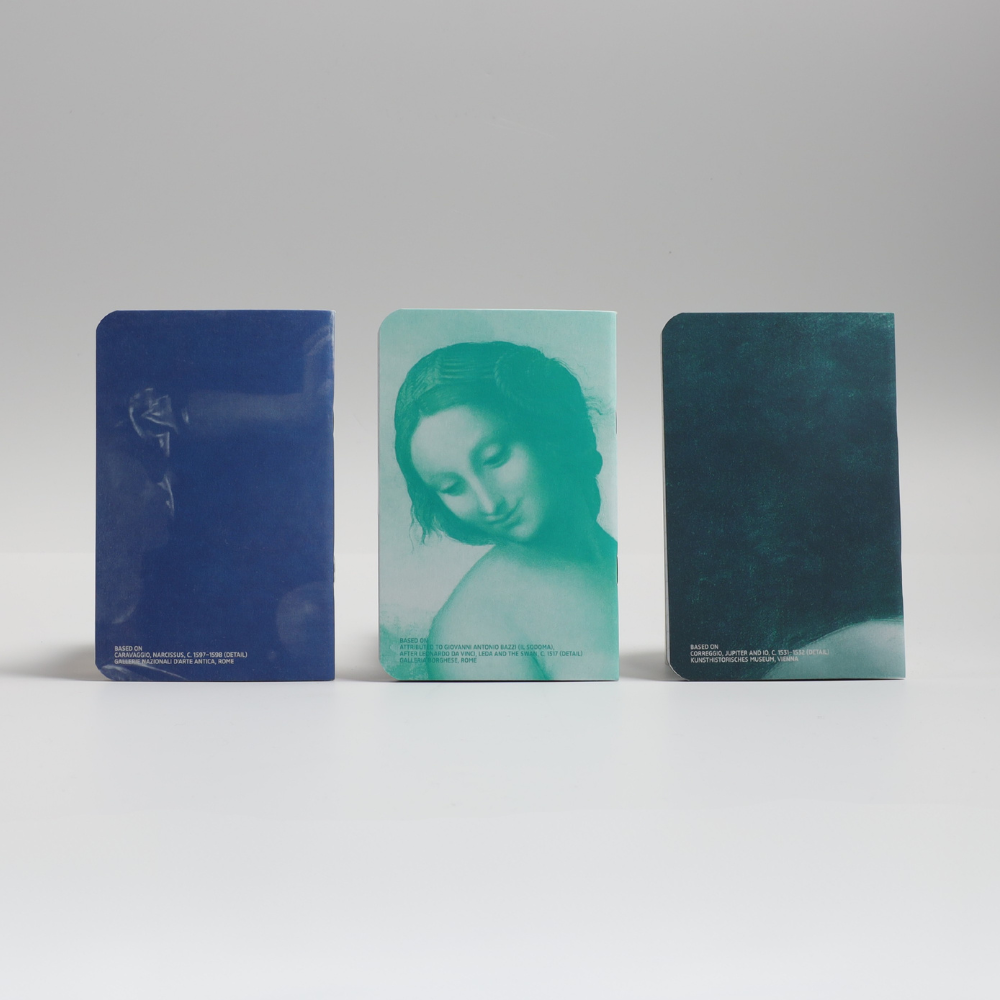 A set of three compact notebooks inspired by famous mythological paintings. The set includes Mini Notebook Narcissus by Caravaggio, Mini Notebook Jupiter and Io by Correggio, and Mini Notebook Leda and the Swan by Leonardo da Vinci. Perfect for all your notes, sketches, or ideas, and a stylish way to experience classical art in everyday life.