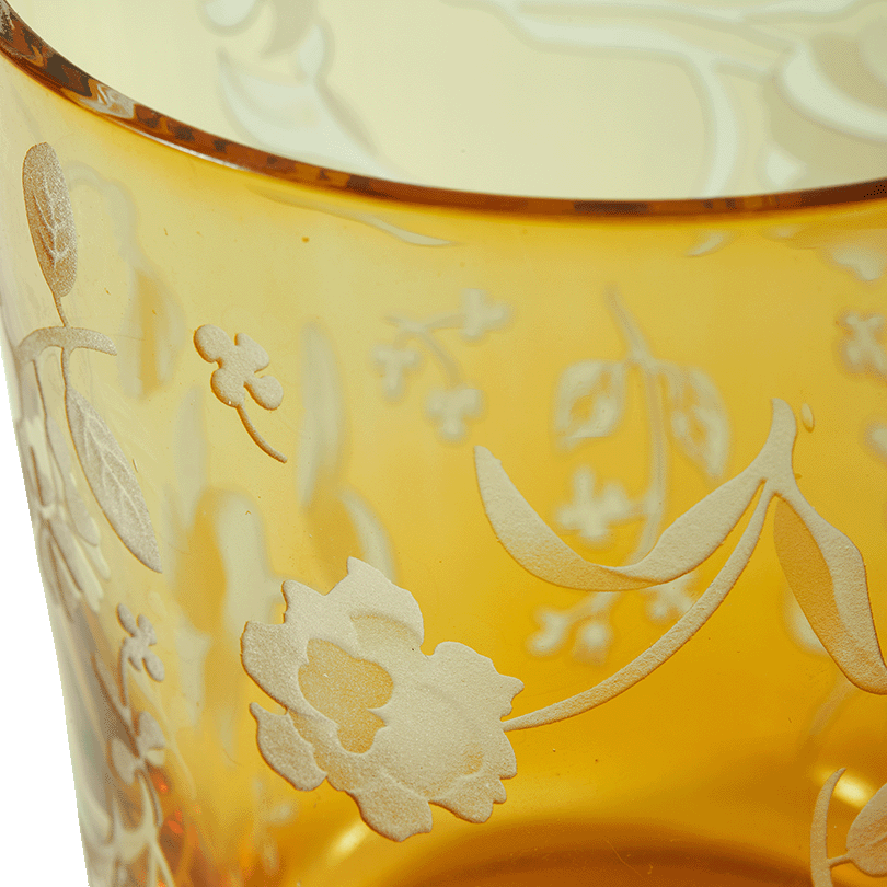 The limited edition Rijksmuseum x POLSPOTTEN collection brings historical motifs into the present through contemporary design. Among the results are these mouth-blown glasses, inspired by the floral pattern of a 17th-century tablecloth, which also appears in the renowned painting Still Life with Cheeses by Floris van Dijck. Classical shapes from the past are combined with rich textures and playful details. The vibrant colours are drawn from Majolica pottery, the predecessor of Delftware. Each colour features a unique floral motif from the tablecloth, turning every glass into a small work of art. Available in orange, blue, yellow, and green.