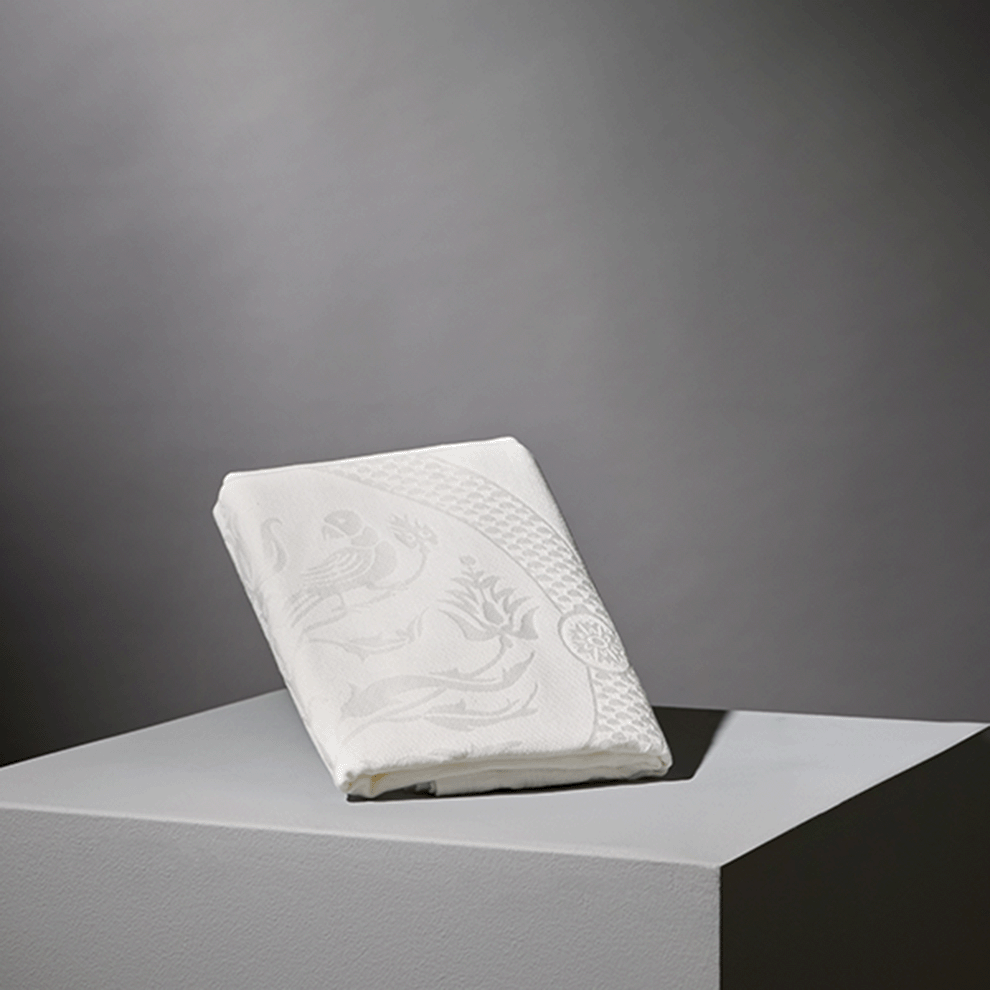 A unique table runner full of history, now for your own table at home. This runner, inspired by the napkin in Still Life with Cheeses, was designed exclusively for the Rijksmuseum. Its timeless white design complements any tableware and setting. The matching napkin is also part of our art collection, featured in the At Home in the 17th Century exhibition. Expertly crafted in France, the runner is rich in detail: birds, flowers, and decorative borders, all in elegant white-on-white jacquard weave.