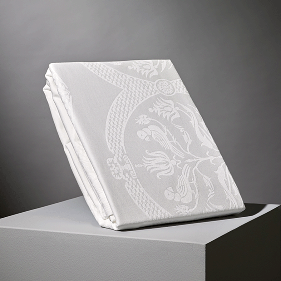 A unique tablecloth full of history for your own table at home. Inspired by the napkin in Still Life with Cheeses, this piece was designed exclusively for the Rijksmuseum. Its timeless white design complements any tableware and setting. The matching napkin is also part of our art collection, featured in the At Home in the 17th Century exhibition. Expertly crafted in France, the tablecloth is rich in detail: birds, flowers, and decorative borders, all in elegant white-on-white jacquard weave.