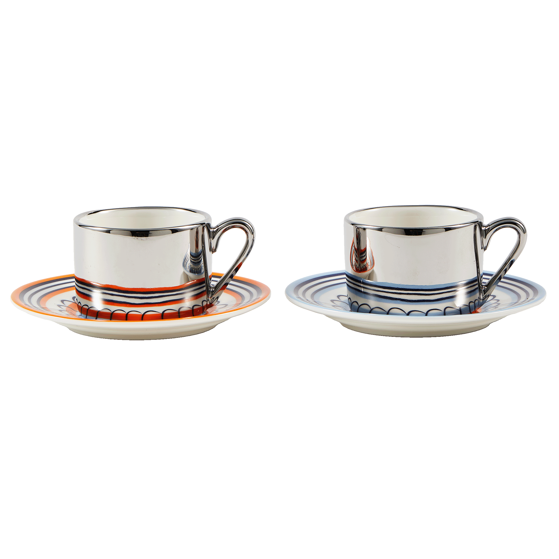 De moderne twist van POLSPOTTEN komt duidelijk naar voren in deze spiegelende espressokopjes, die in samenwerking met het Rijksmuseum zijn gemaakt. Het patroon van het schoteltje wordt op een speelse manier gereflecteerd in de spiegelende kopjes. De schotel is geïnspireerd op een schotel uit de 17de eeuw met rozetdecor uit de collectie van het Rijksmuseum. De kopjes met spiegelende illusie zijn typisch POLSPOTTEN. Samen vormen kop en schotel een verbinding tussen traditie en vernieuwing. Beschikbaar in de kleuren oranje/blauw of en geel/groen.