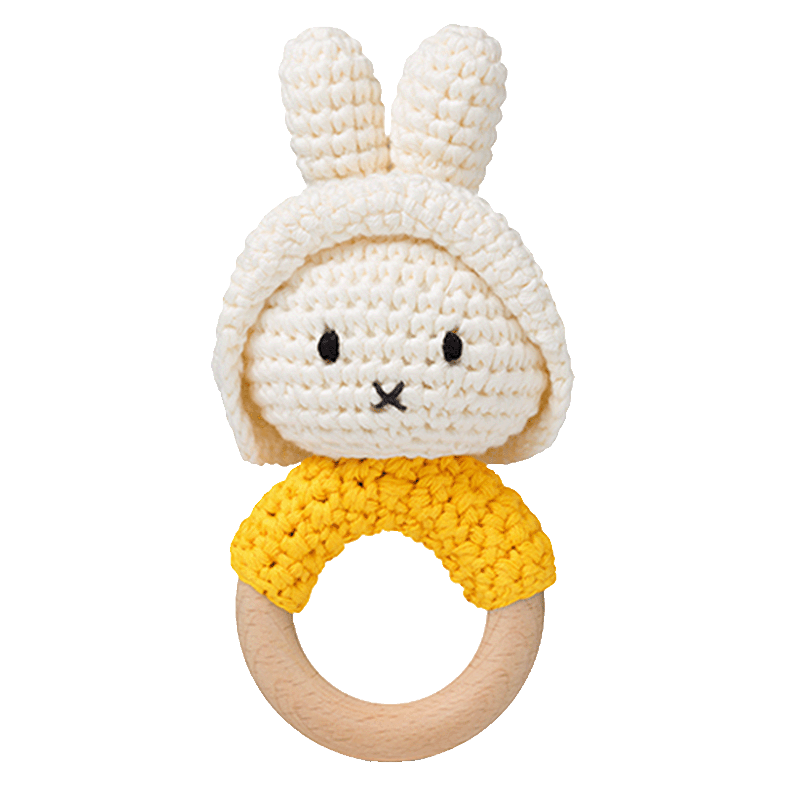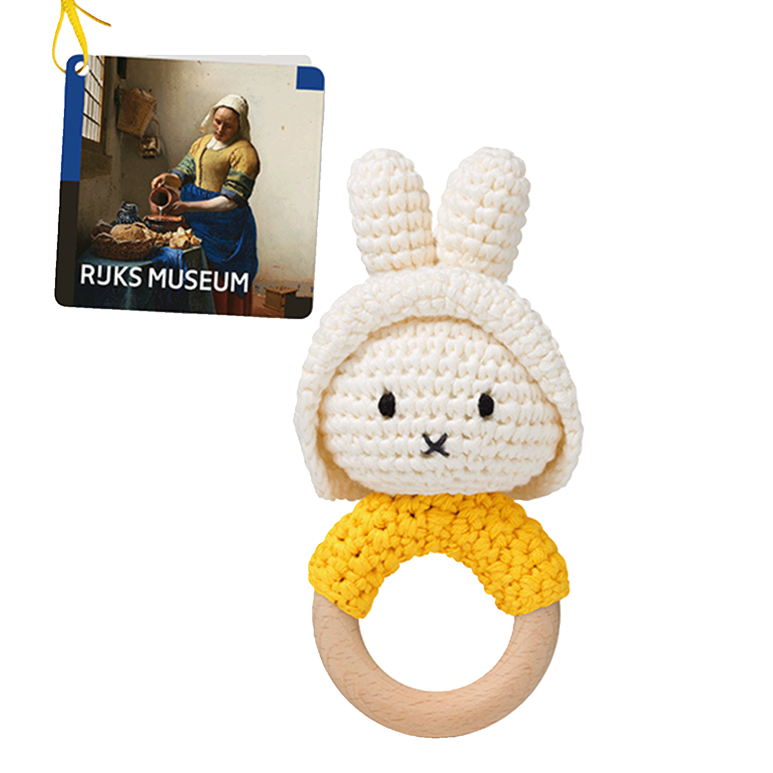 Een handgemaakte gehaakte Nijntje x Melkmeisje bijtring, speciaal voor de allerjongste kunstliefhebbers. Zodra je met de bijtring schudt klinkt er een zacht rammeltje dat de zintuigen van je kleintje prikkelt. Verkrijgbaar in de kleuren geel en blauw.